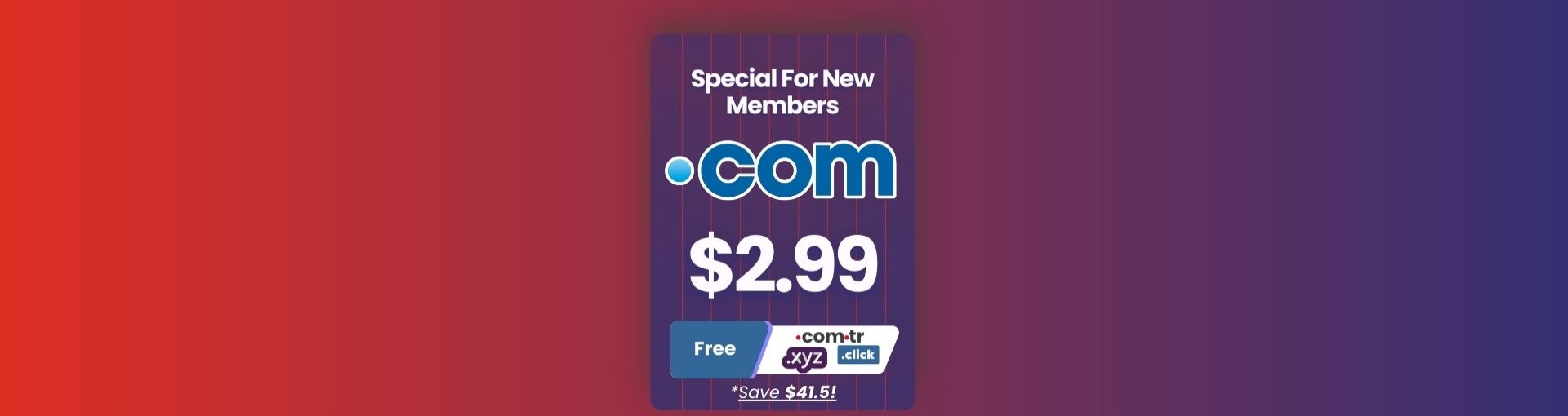 Khách hàng khi đăng ký tài khoản lần đầu trên hệ thống sẽ có cơ hội sở hữu tên miền đuôi .COM với mức giá chỉ $2.99 cho năm đầu tiên. Ngoài ra, bạn còn được nhận tên miền .COM.TR, .XYZ, và .CLICK hoàn toàn miễn phí nữa. Nếu mua kèm thêm tên miền .NET sẽ chỉ phải trả thêm 4.99$ mà thôi.