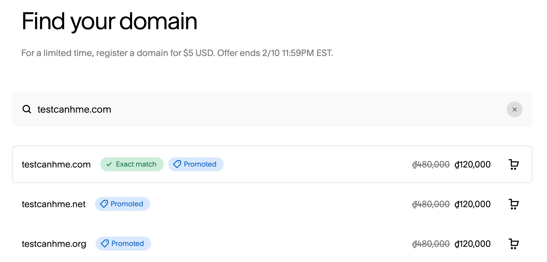 Squarespace đang giảm giá đăng ký mới .COM/.NET/.ORG giá chỉ còn có 120k (tương ứng 5$) cho năm đầu tiên. Giá gia hạn những năm sau sẽ là 480k (20$).
